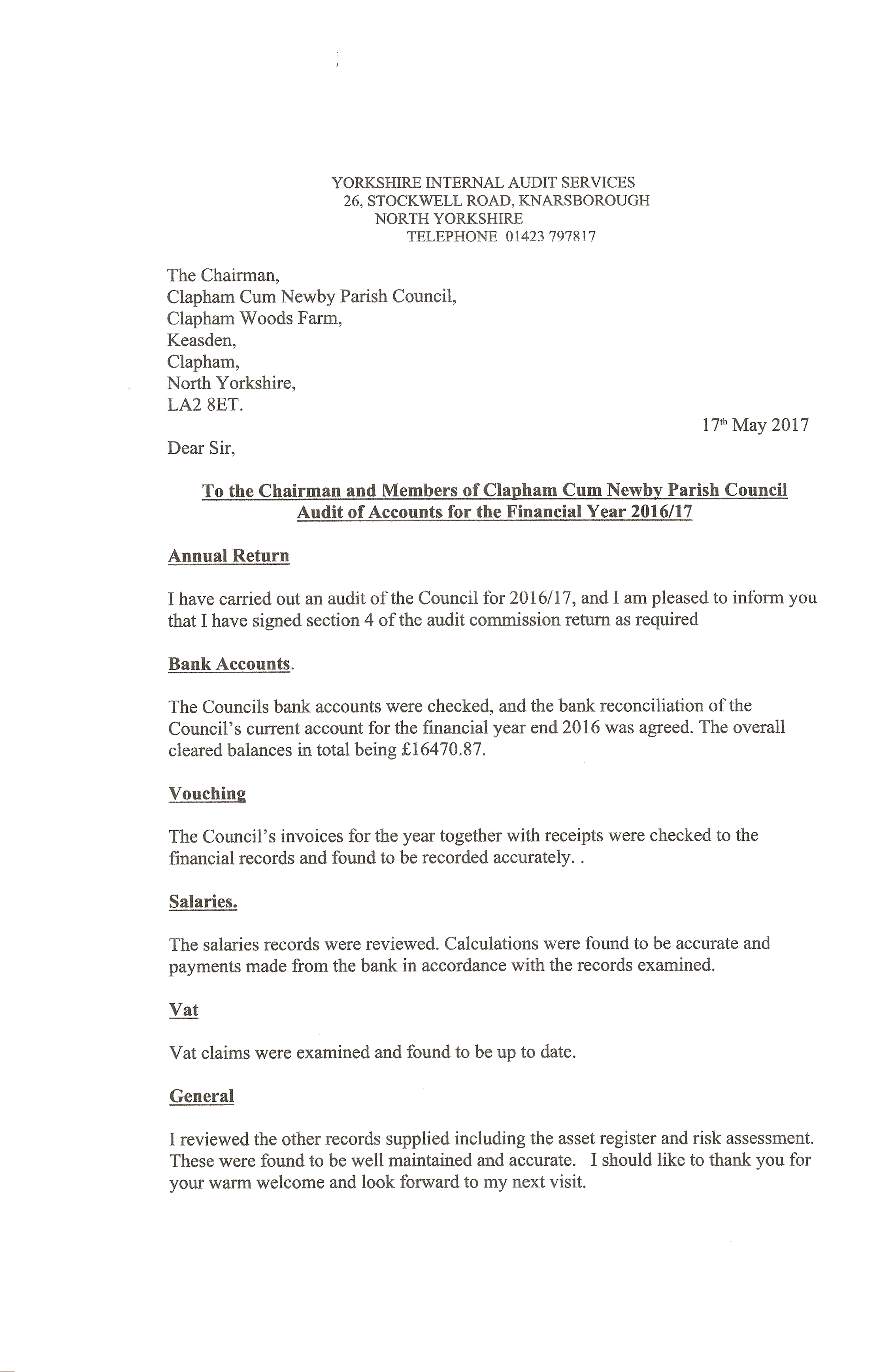- Steve Culver – 015242 51862 – clerk@claphamcumnewby-pc.gov.uk